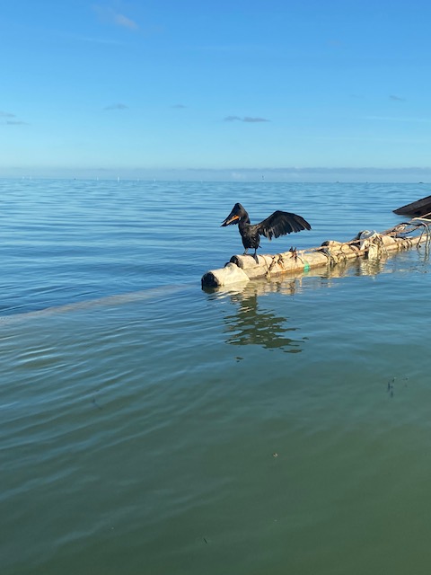 When we first arrived at Oceanview Gem, our house for January, with gentle ocean breezes caressing our skin instead of bitter frost threatening our fingers with frostbite, beyond one of the smaller palms, there was something in the water. Conjecture ensued as it often does with the clan, about what exactly the object is. “That’s not an island, because there is nothing growing on it.” “It has to be mand-made, but what are those standy-uppies on it?” I took a photo with my iPhone and then used the zoom feature. “I think those are birds and it looks like an overturned hull of a boat,” I offered. An hour or so later, as we watched some kayakers approach, it was our chance to fill in part of the mystery. If they were birds, they would surely fly away when the kayakers got close enough. If the kayakers climbed on it, it would have to be solid, like a rock outcropping or a structure for docking. The standy-uppies flew away, so they were birds, comorants actually, whose diving skills are legendary but as an evolutionary consequence, they lack the weather-proofing oil glands of most birds, so must sun themselves for hours to dry out their plumage after diving.