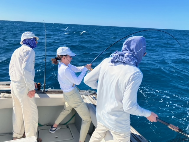 Les caught the first fish, a too small yellow tail, although at 11 inches, if I had just stepped on it, it would have met the 12″ threshold to keep. Fish 2 and 3 came for Lisa and Les, as did 4 and 5, all yellowtails and over 12″ and George had had enoough with my new pole, and traded me out for one of his. Not surpisingly, I immediately caught a porgie worth keeping.